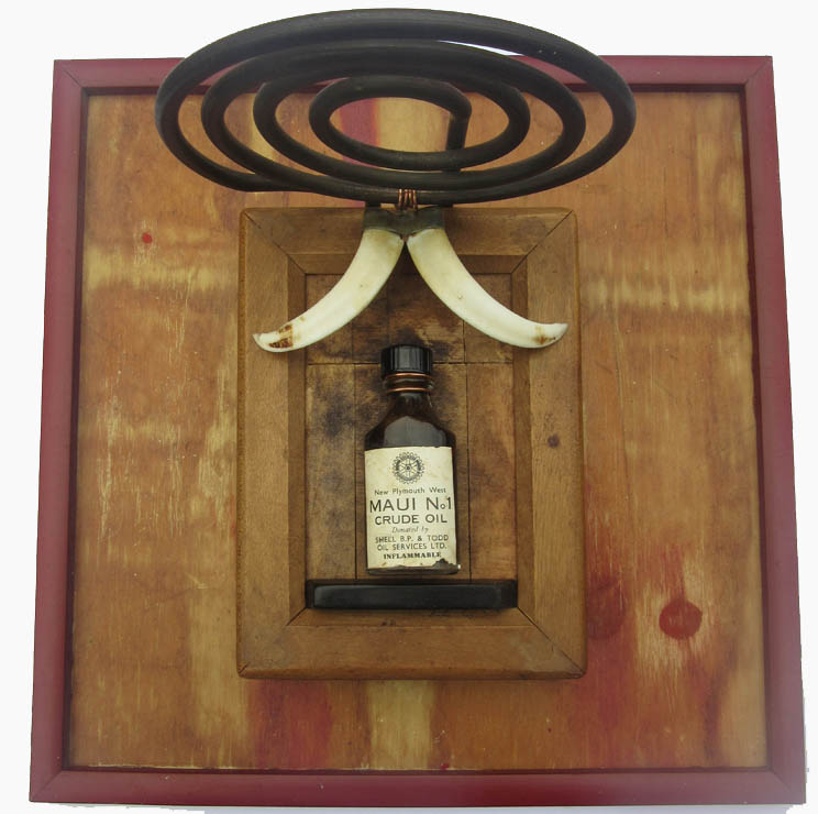 old stove element, souvenir bottle of Maui oil, hanging tusks