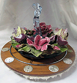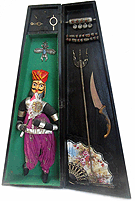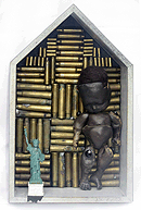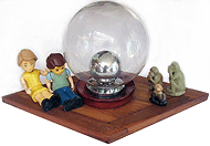 (His shirt says 'SOMETHING WICKED THIS WAY COMES' - from Shakespeare's Globe in London.)In the middle, part of an assemblage I made 25 years ago, titled: