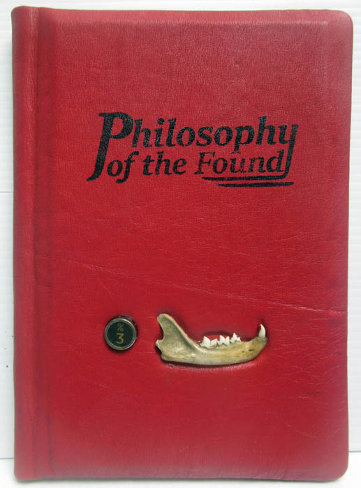 handbound with red recycled leather, inset with possum jaw and old typewrite key