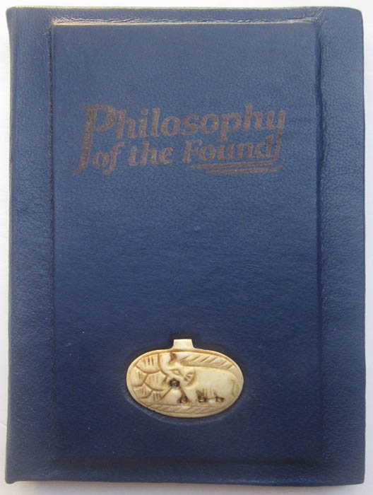 handbound with dark blue Italian leather, inset with a carved bone elephant pendant.