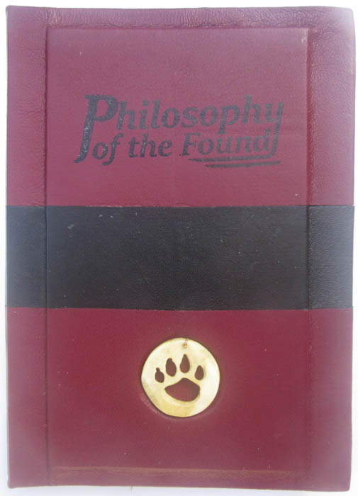 handbound with burgundy Italian leather with stripe of black, inset with carved bone pawprint.