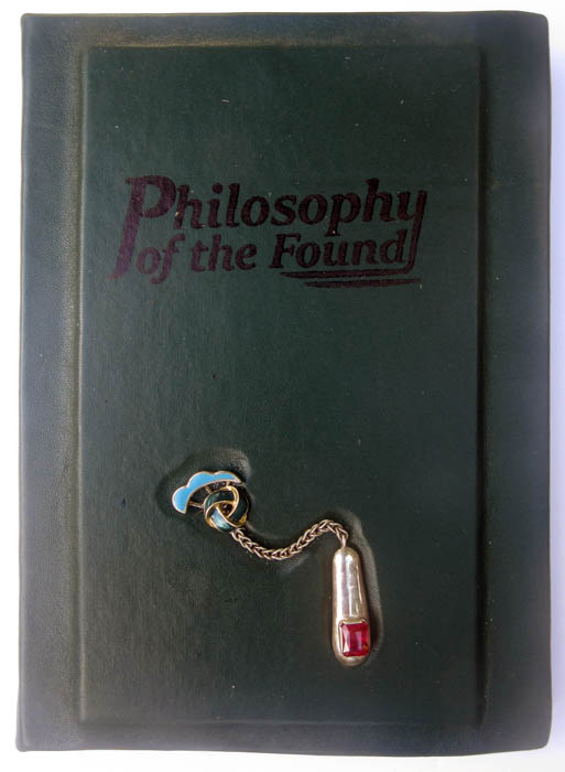 handbound with dark green Italian leather, inset with slver chain and red-stone pendant, with enamel ornaments.