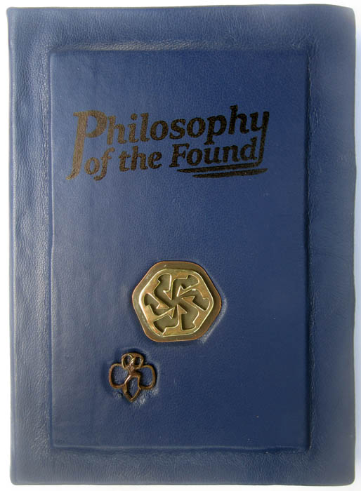 handbound with blue Italian leather, inset with handcrafted copper brooch & bronze brownie badge.