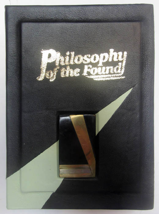 handbound with black Italian leather spliced with mint green, with Art Deco tile inset with different metals.