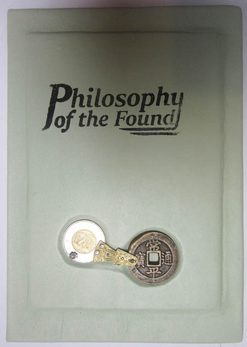 handbound with 'champagne' coloured Italian leather, with Canadian and Korean coins linked with old brass watch parts.