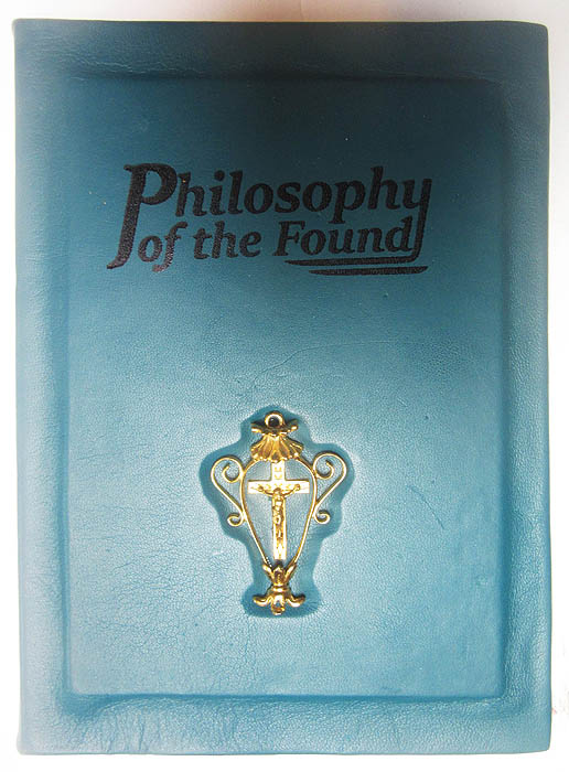 handbound with green/blue Italian leather, with golden crucifix in a golden chalice.
