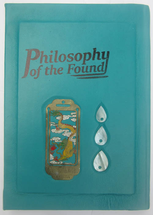 handbound with blue/green Italian leather, with pierced and painted thin brass panel, and mother-of-pearl tears.