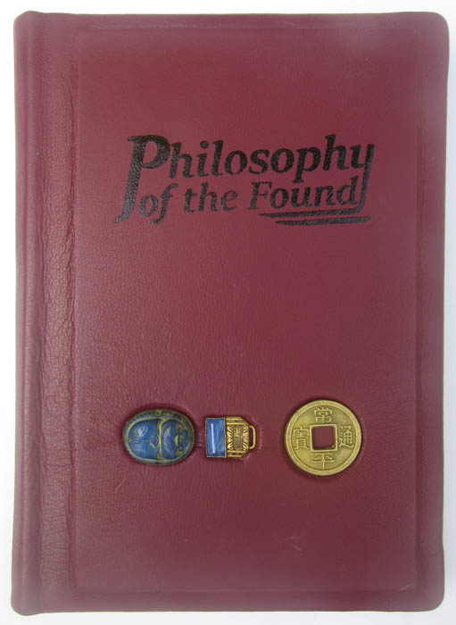 handbound with maroon Italian leather, inset with a carved blue stone scarab and gemstone set in brass, and a Korean coin