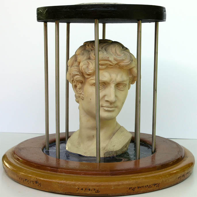 marble head, caged in steel & wood