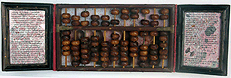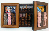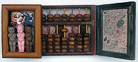 6 kewpie dolls, old abacus, frames hinged with leather, text printed on marbled paper.