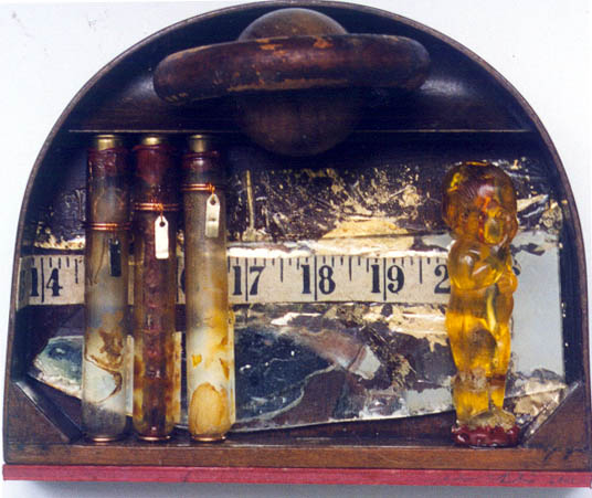 assemblage - test-tubes, wax, gold foil, mirror, cast resin kewpie doll, wooden ball ....