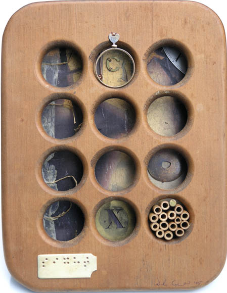 lens & ivory on wooden egg holder over collage & found objects.