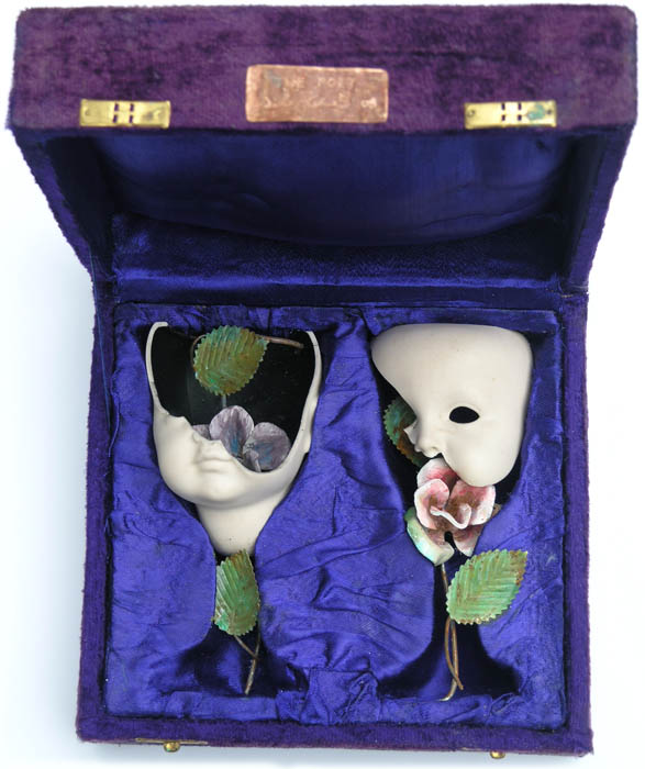 broken porcelain doll's head, metal flowers, in velvet box made for goblets.