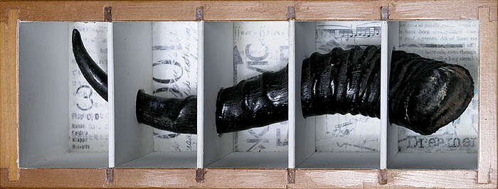 Goat horn through partitioned wooden box. Text from different languages & sciences.