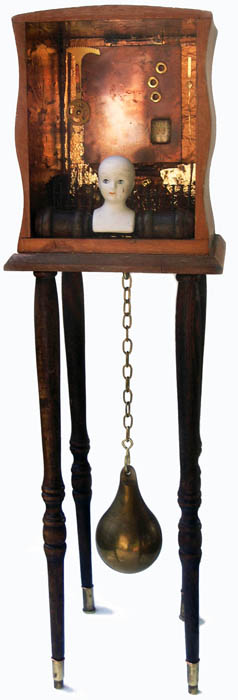 old ceramic doll head, copper etching plate, brass, gold foil, glass, nails