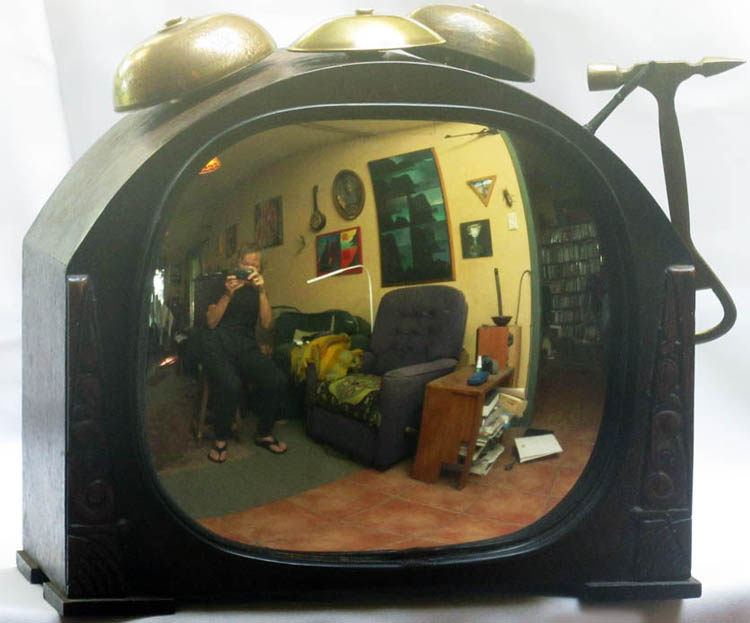 Rear vision mirror from a truck, bronze bells and hammer.