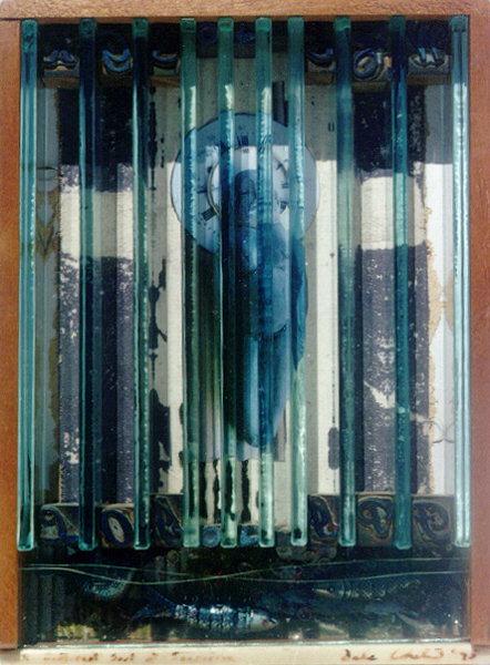 So the piece of stained canvas was waiting for a use, and heavy with its own meanings. The small figure of a pregnant woman had been given to me by a friend, and I photographed it with wedding ring and pocket watch face for a halo. It sat well on the cruciform stains, and I loved the way the thick glass pieces reflected and disturbed the image. I needed spacers to hold the glass slabs apart and to support them tightly in the wooden box - old lead printing type was just right, with hints of meaning, the suggestion of a solution to the puzzle. The meaning of life, or some meaning to death.