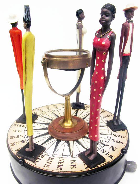 When you spin the turntable, the figures and the compass spin, looking forwards, looking outwards,