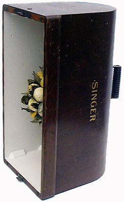 In an old Singer sewing machine cover, the stuffed bird sings on a leaden tree.
