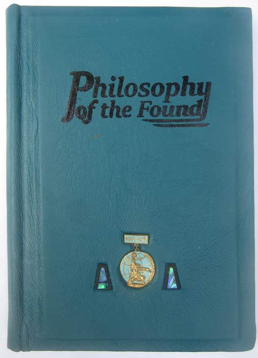 handbound with dark blue/green Italian leather, inset with Russian ‘Peace on Earth’ medal and 2 paua pieces.