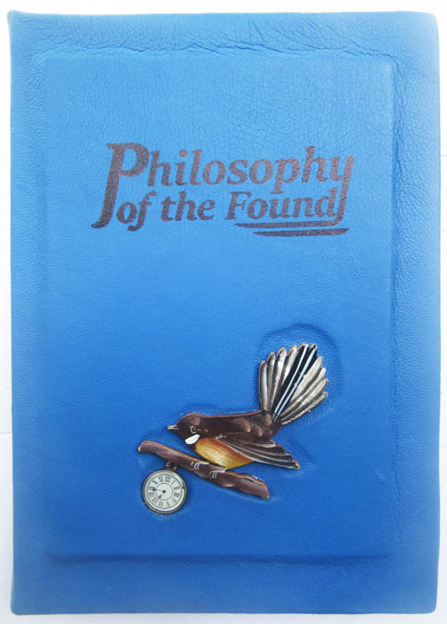 Handbound with blue Italian leather, with painted wooden fantail by Caroline Claus, and a small clockface.