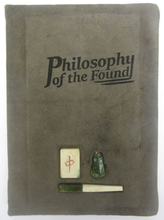 handbound with recycled khaki-coloured suede leather, inset with ivory and greenstone ... a rune, a hei tiki, and pieces of two chopsticks.