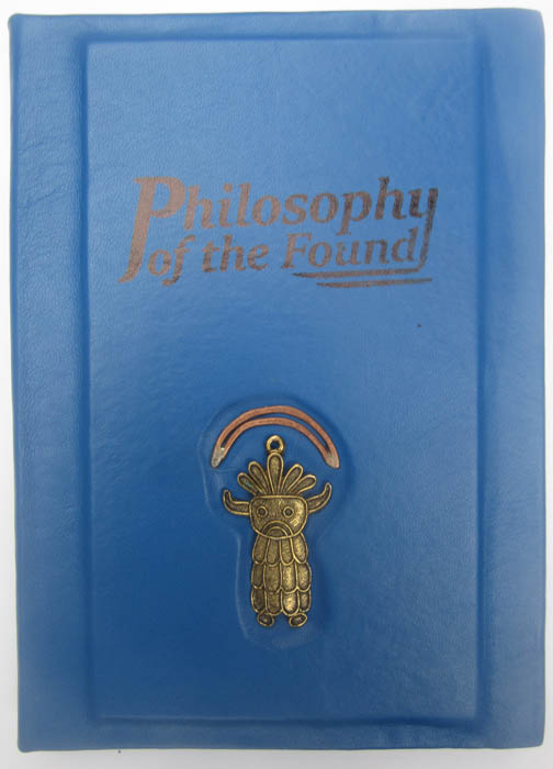 handbound with blue Italian leather, inset with cast bronze sun-god pendant, and curved copper wire, silver-soldered.