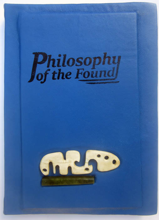 handbound with bright blue Italian leather, inset with carved bone and rod of pounamu.