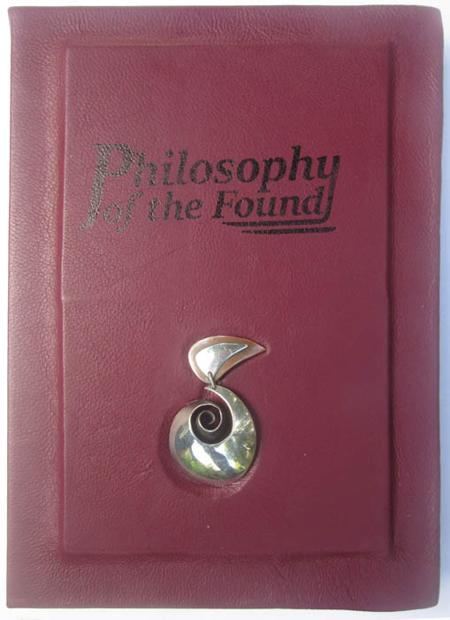 handbound with dark red Italian leather, inset with a brooch I made from a silver spoon.