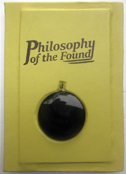 handbound with yellow Italian leather, inset with slightly domed disk of polished gemstone, like star sapphire for the different colours as light plays over it.