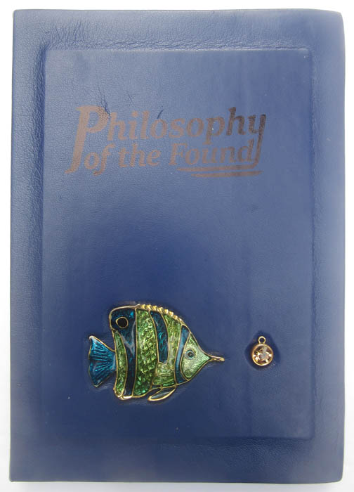 Handbound with dark blue Italian leather, with blue & green enamelled fish & sparkling topaz gem.