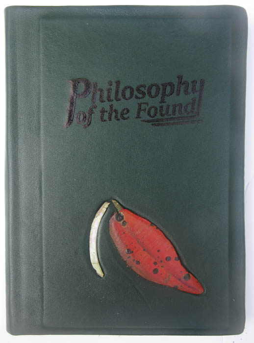 handbound with dark green Italian leather, inset with curve of pauau shell and a wooden leaf, hand carved and painted by Linda McFetridge of Taranaki