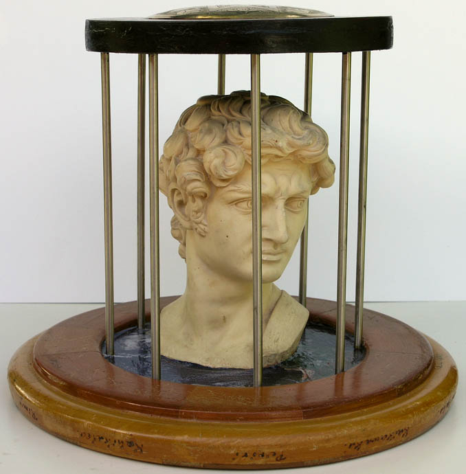 marble head, caged in steel & wood