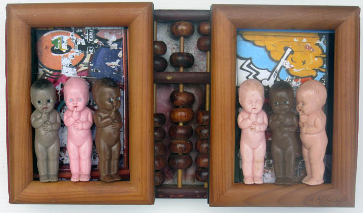 6 kewpie dolls, old abacus, frames hinged with leather, text printed on marbled paper.