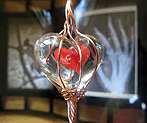 glass heart in copper cage, with X-ray images in curved glass frame