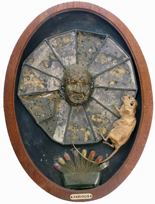 The texture is much worked on, with gold leaf and drops of lead solder spattered behind the glass. The blackboard at the back of the old oval frame is for my years of teaching. I told the students I wanted the formula eiπ = -1 on my tombstone. There's a pure beauty in mathematics. The dead rat? It's me, too. Or will be, soon enough. And the spray of false finger nails - it took me 40 years to get over the self loathing and guilt induced by thin models and fat advertisers.