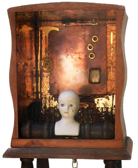 old ceramic doll head, copper etching plate, brass, gold foil, glass, nails