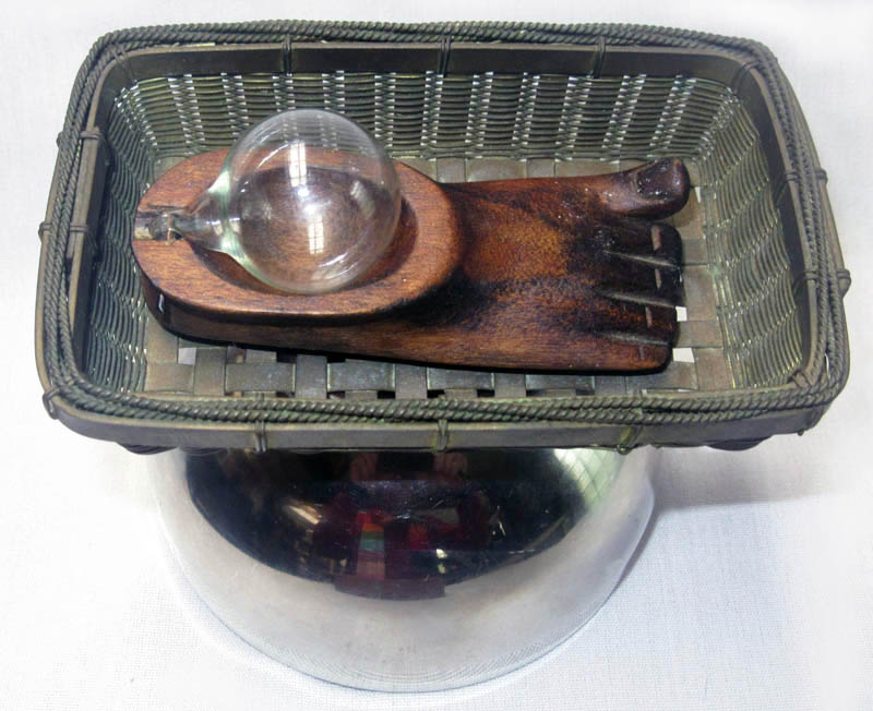 carved wooden foot with a glass bubble