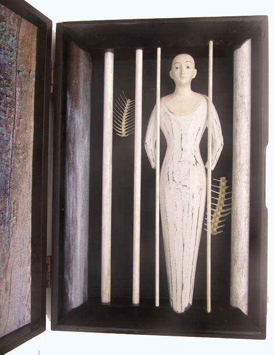 Assemblage of found objects in an Asian lacquered gift box