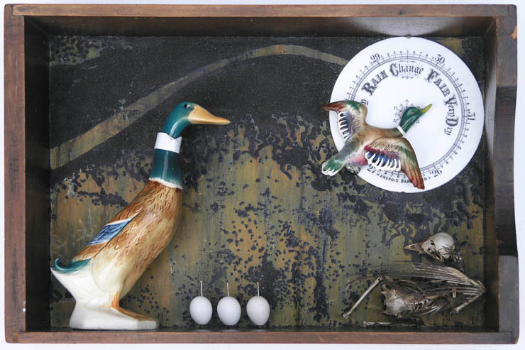 china ducks, old barometer face, bird skeleton, cockatiel eggs