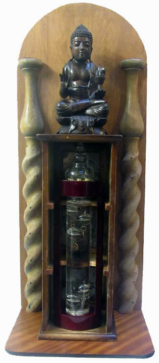 Buddhist carved figure, thermometer with floating glass bubbles