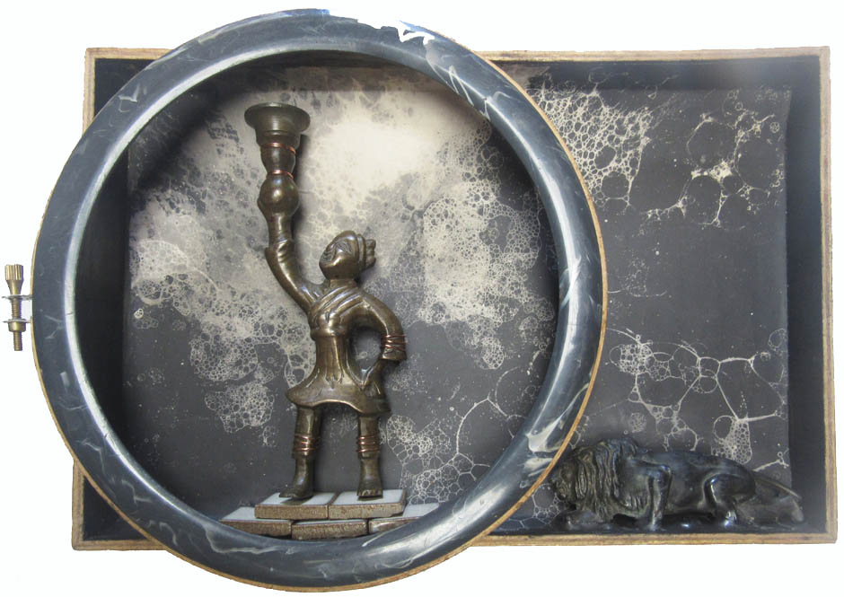 Bronze figures in wooden embroidery frame, with photogram of bubbles from my years playing in the darkroom.