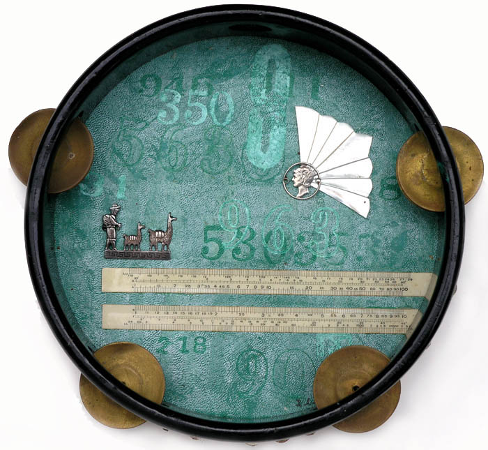 Silver, ivory scales, mother of pearl, printing on leather. In Salvation Army tambourine.