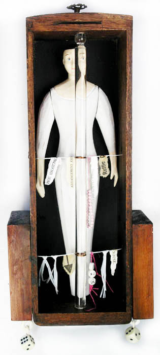 Here a remote-looking figure looks out past a distorting glass rod, hung with fragments of lost meaning - disconnected words, symbols, beads.