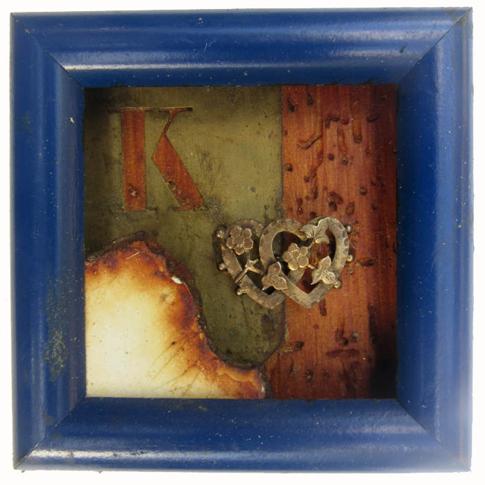 Piece of rusted steel and 'K' brass stencil, on battered wood.