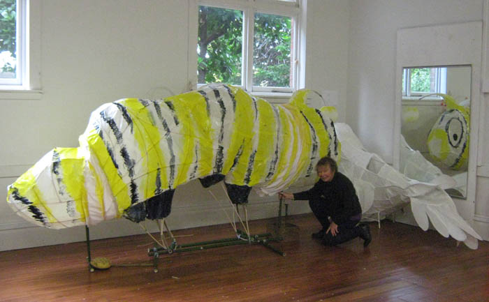 I finished the commissioned lantern for New Plymouth's Arts Festival lantern parade. Madly ambitious, to make a huge lantern with two bendy-bus segments