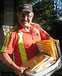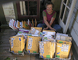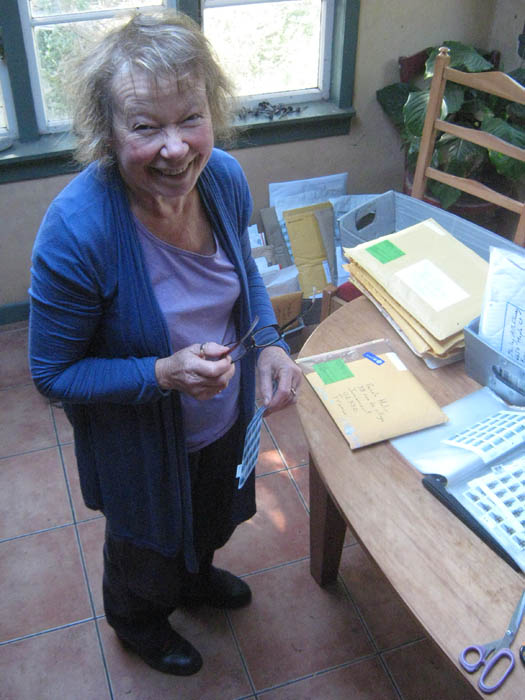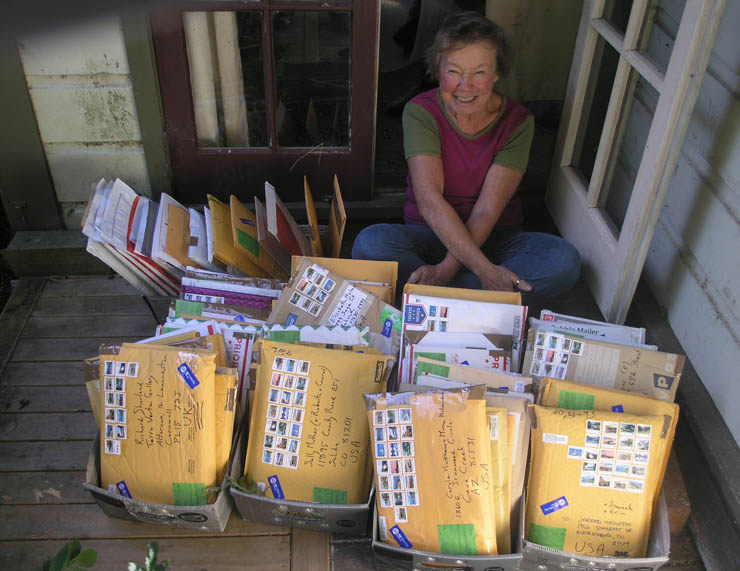 office. Here I am waiting for the rural postie to arrive on Monday. And on Tuesday I took the big box, one collage from each artist, to