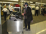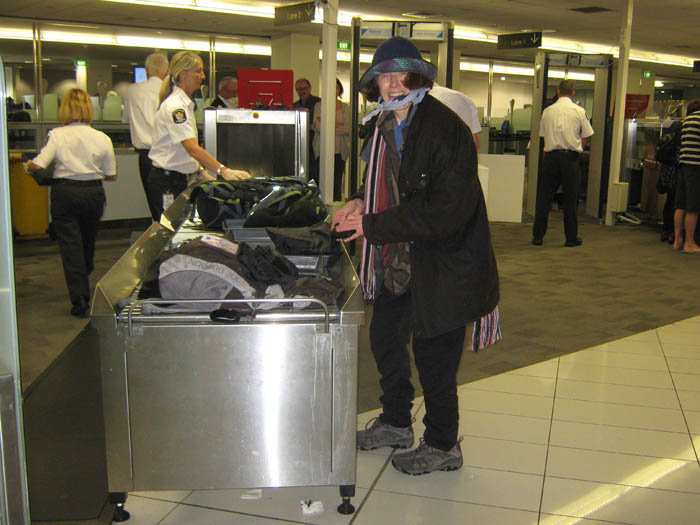 From the left, the intrepids (Dale, Laurel, Caryl, our driver Alan, Anne, Mili); Mili counting luggage trolleys at Auckland; Anne after her striptease of 4 jackets, all the chains around her neck, and the
