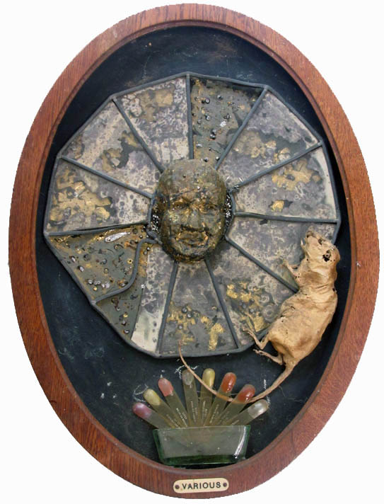 The texture is much worked on, with gold leaf and drops of lead solder spattered behind the glass.