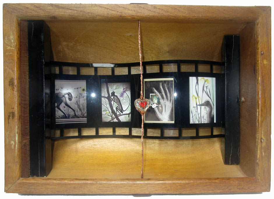 glass heart in copper cage, with X-ray images in curved glass frame